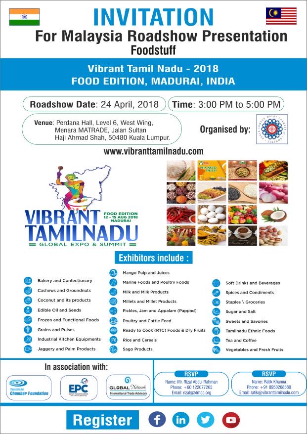 Dengan sukacitanya ingin dimaklumkam bahawa penganjur program Vibrant Tamil Nadu Global Summit and Expo 2018 telah menjemput DPMM Kuala Lumpur sebagai rakan penganjur untuk roadshow yang akan dilaksanakan di Malaysia. Atas jemputan itu, pihak DPMM Kuala Lumpur telah mencadang untuk menganjurkan roadshow tersebut di:
